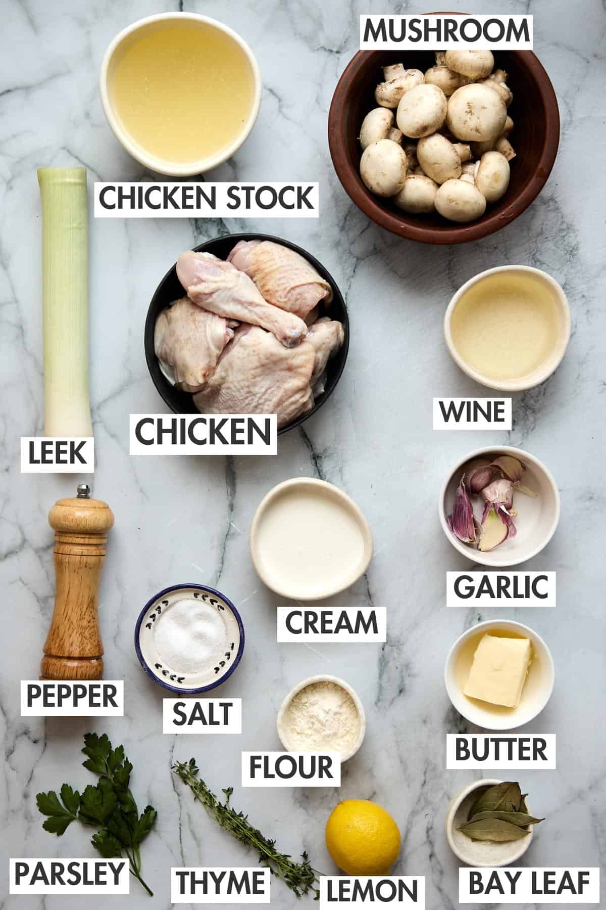- Something starchy - You need a starchy element to enjoy with the sauce. I like serving my chicken fricassée with creamy mashed potatoes, buttery fondant potatoes, or simple fluffy rice. If you have some at hand, I also like mopping up the sauce with a crusty piece of sourdough bread.