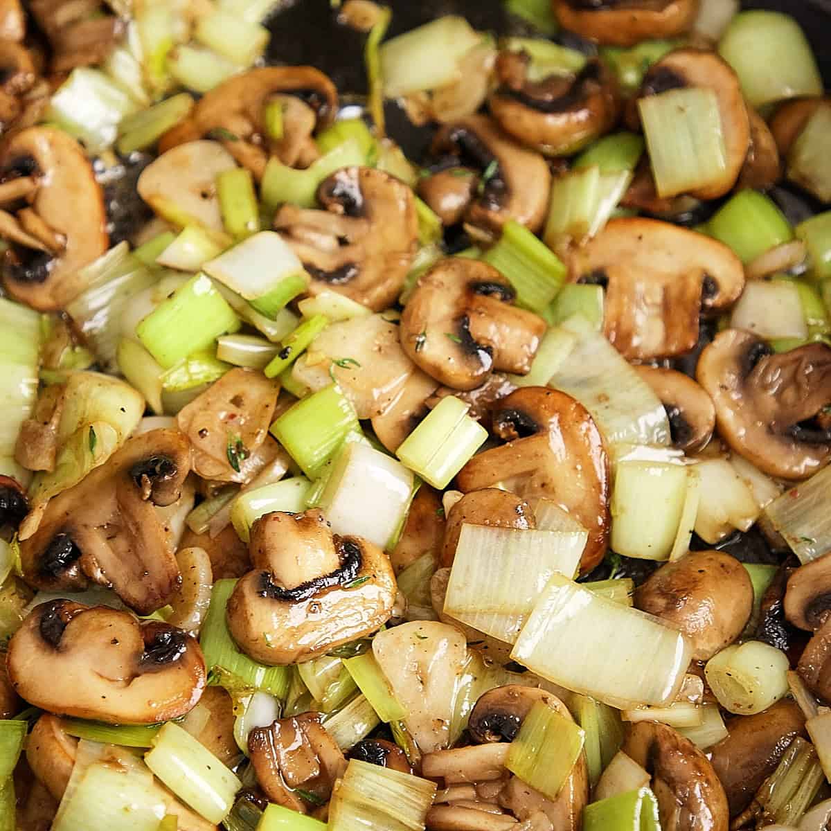 - Cook the Leeks: Add butter, sliced leeks, thyme, bay leaf, and garlic to the pan. Gently sweat them until they become soft and sweet. To prevent them from browning, add a pinch of salt and cook on low heat. We separate the mushrooms from the leeks so the leeks stay blonde while we caramelize the mushrooms.